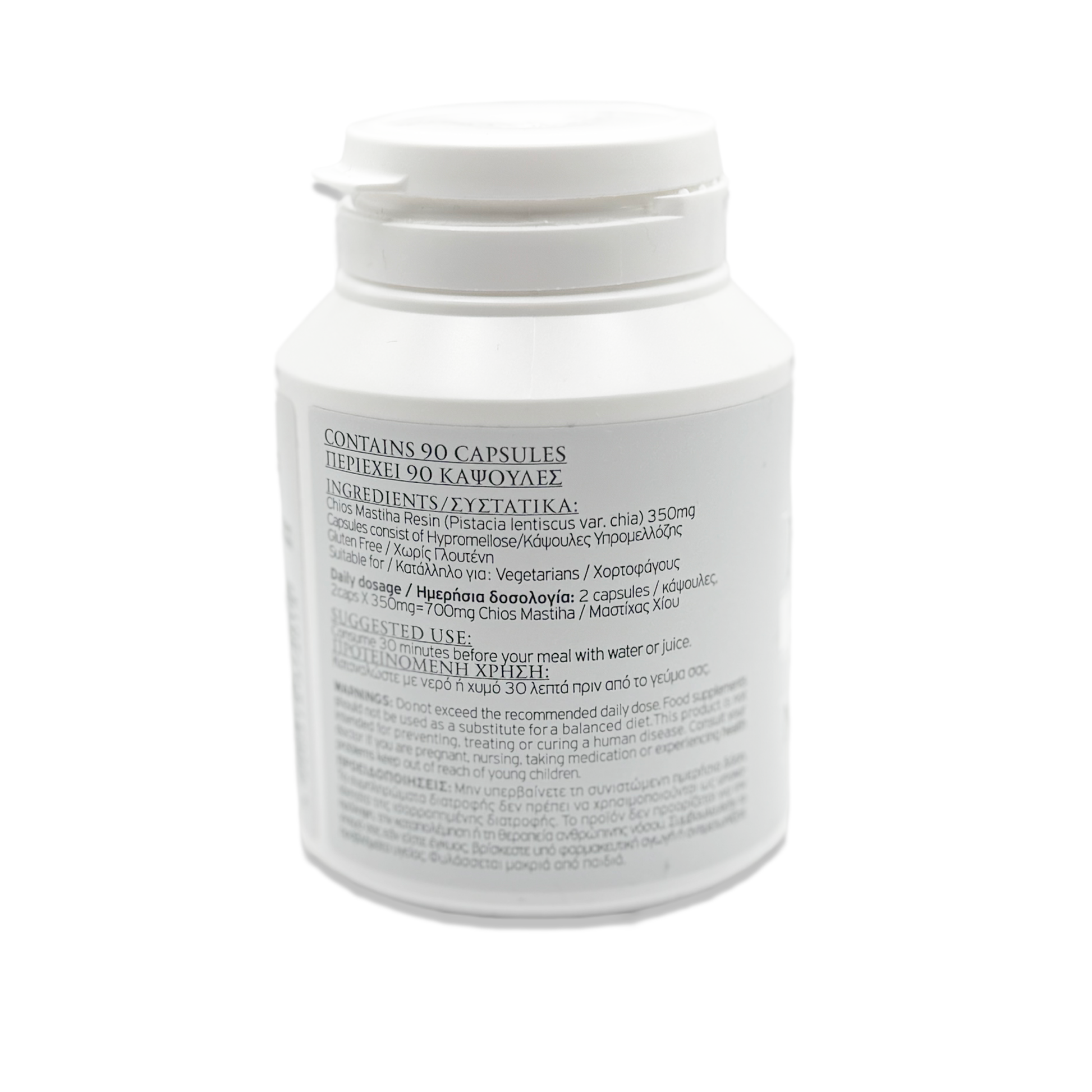 En kapselflaske inneholder 90 kapsler, med 350mg Mastic per kapsel. Dette tilsvarer 45 dagers forbruk, med den anbefalte dosen på 2 kapsler hver dag.